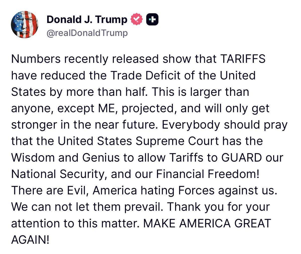 特朗普近日在社交平台上强调,持续对进口商品征收关税已使美国贸易逆差“减少超过一半”,并呼吁最高法院维持政府征收关税的权力。他表示,这一成效“超过所有人预期”,并称未来增益“将进一步增强”,强调关税有助于保障国家安全和财政自由。