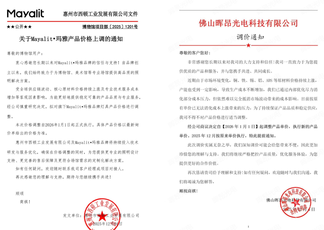 刚过去的2025年12月,照明企业已密集开启新一轮涨价措施。1日,西顿照明旗下照明品牌Mayalit·玛雅率先发函,自2026年1月1日起全面调整灯具售价;4日,佛山晖昂光电以铜、铁、锡、铝、ABS等原材料持续飙升为由,宣布同步上调产品单价;12日,中山未徕照明在朋友圈紧急通知,铜价已突破9.4万元/吨年内新高,各类成本叠加,公司将于元旦起开启涨价模式;25日,中山泓硕光电因电池片原料暴涨,即日起上调所有光伏板价格;29日,深圳明安光电宣布自2026年1月1日起全线产品价格上调。