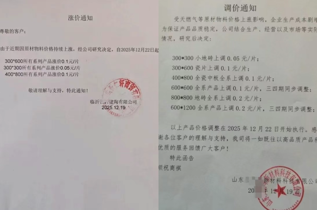 除了照明企业,近期有陶瓷企业也实施涨价。据陶城报报道,近日山东、河北、四川、广西、重庆等产区多家陶企发布瓷砖涨价通知,其中价格上调幅度最大的为广西某企业,基本达到“800×800(mm)每片上涨0.5元,700×1500(mm)每片上涨1元,800×1350(mm)每片上涨1元”。随着年终停产季到来,预计接下来将有相当一部分企业会上调产品价格。