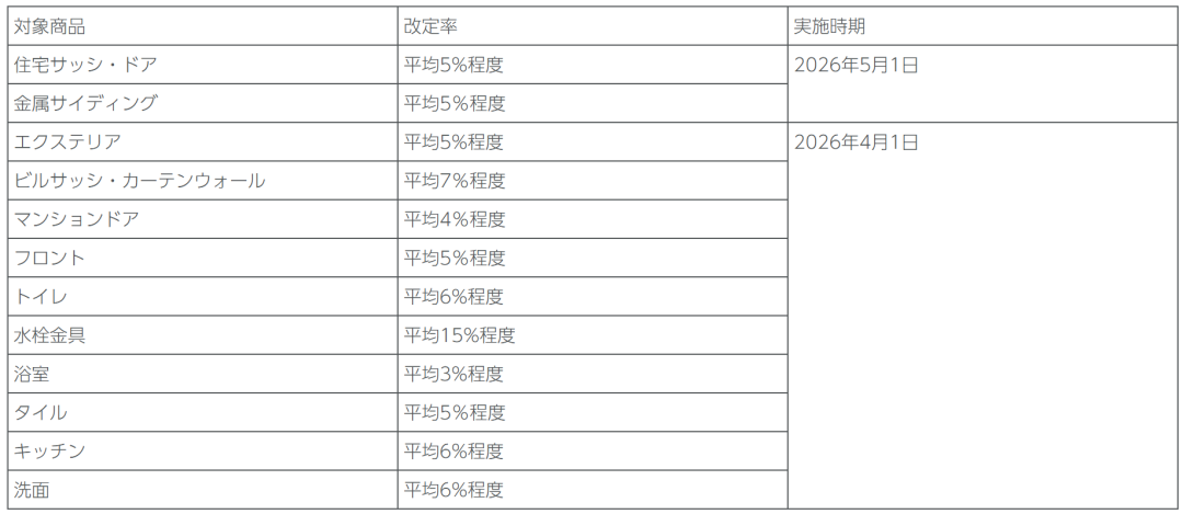 卫浴行业中,近期率先宣布实施涨价的有骊住集团。据骊住集团2025年11月7日公告,该公司宣布自2026年4月1日起陆续上调部分产品价格。主要产品的平均调价幅度如下:住宅窗框、门、金属外墙板、室外工程、入户门、瓷砖约为5%,商用窗框与幕墙约为7%,公寓门约为4%,马桶、厨房、台盆约为6%,水龙头约为15%,浴室约为3%。新价格将适用于2026年4月1日(部分为5月1日)起接到的订单。