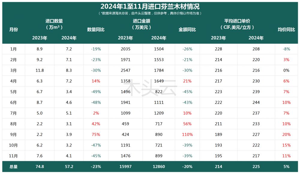 然而,尽管芬兰国内圆木市场整体表现强劲,但其对中国市场的出口却出现了大幅下滑。根据海关数据,2024年11月,芬兰对中国的木材出口量同比下降了45%,降至4.1万立方米;出口金额也下降了39%,仅为899万美元。11月芬兰出口至中国的木材平均单价增长了11%。