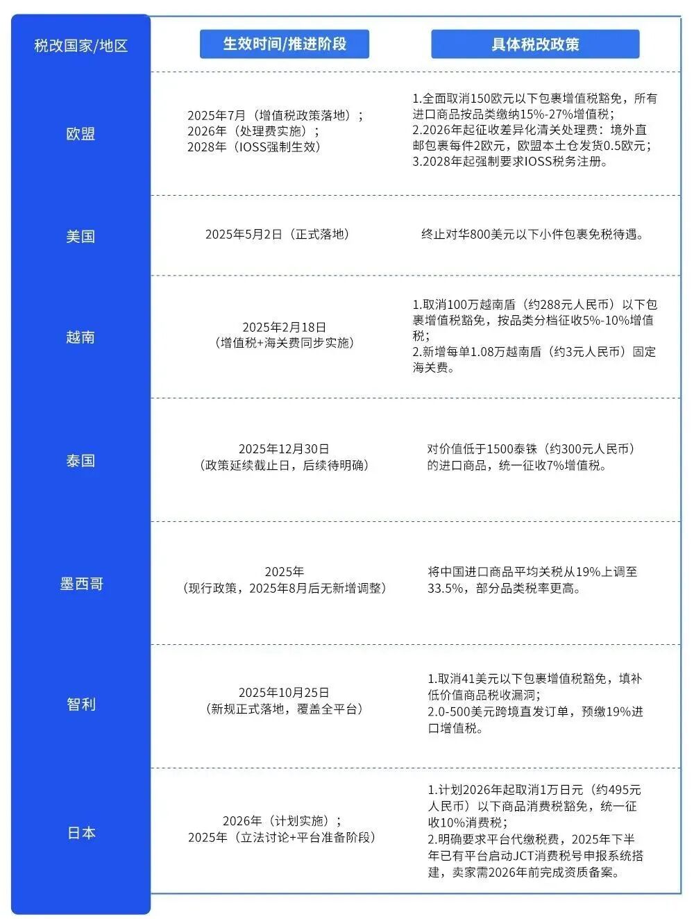 2025年全球范围内跨境税收政策收紧浪潮席卷而来,欧美、泰国、越南、马来西亚、墨西哥、巴西等国家纷纷取消跨境电商免税政策,这股风潮正从欧美成熟市场向东南亚、拉美等新兴赛道蔓延。